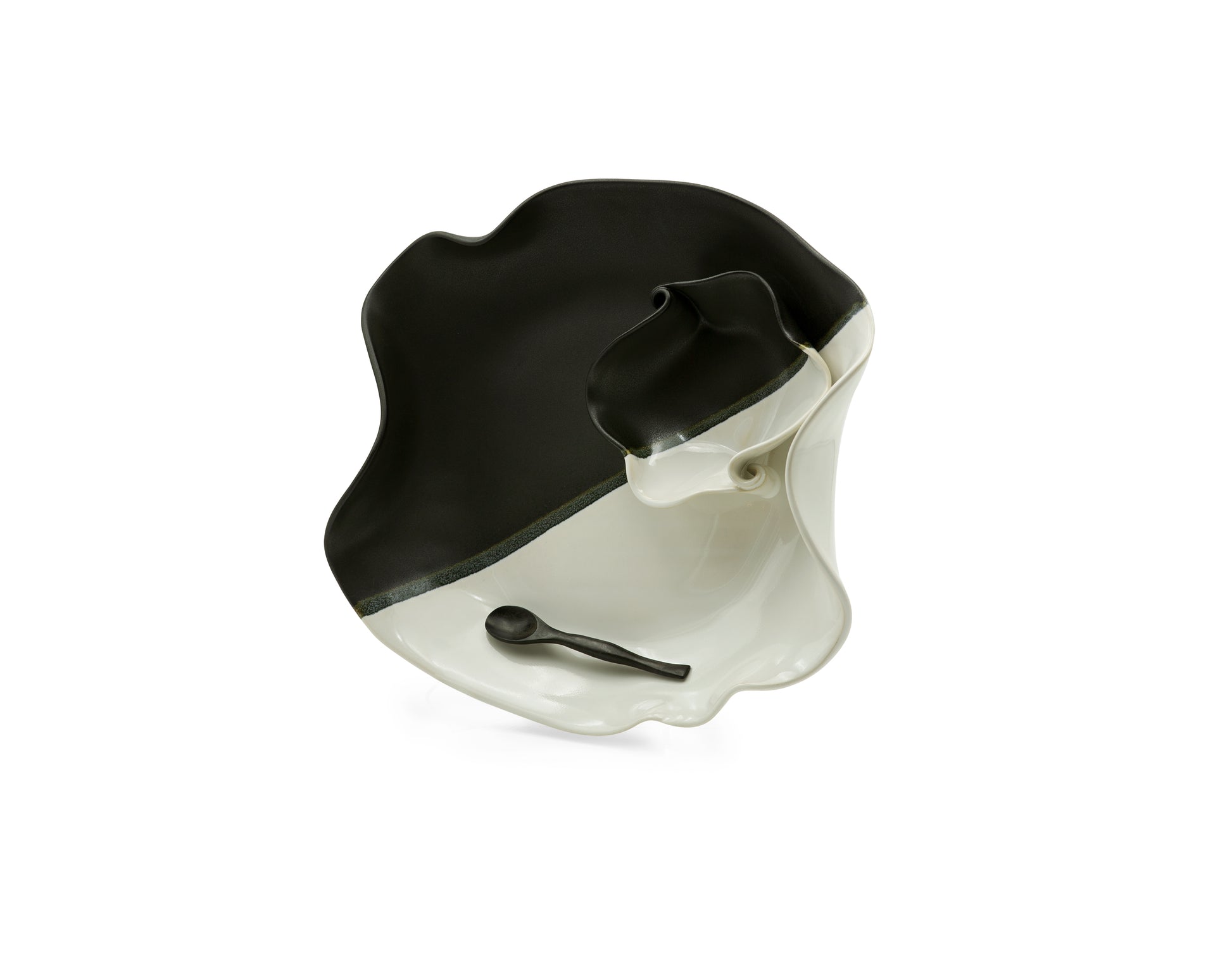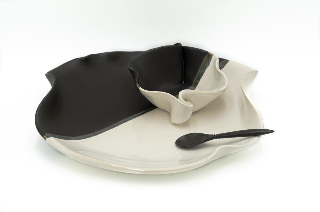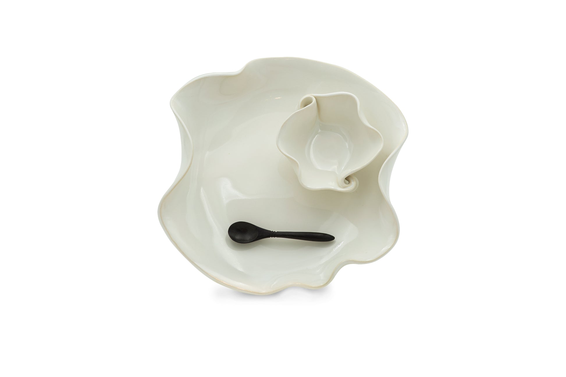 This handmade porcelain dip set has an attached mini bowl with rosewood spoon for condiments. From sushi to fruits to chips, it's a perfect size for a group yet great for two.