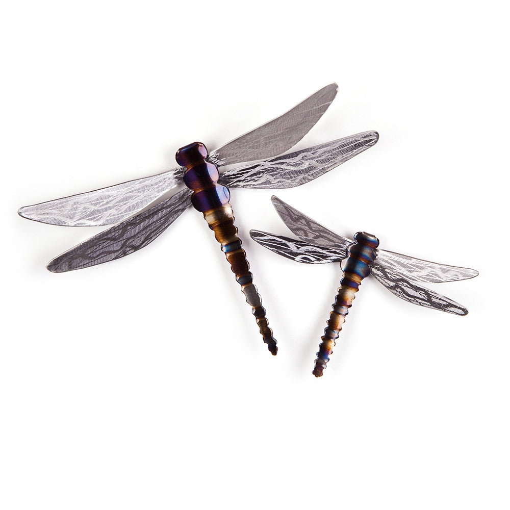 These intriguing, sculptural dragonflies are made of steel with resin and flame work for detailing. Each comes with a tack for hanging on your wall. Can be hung indoors and outdoors!