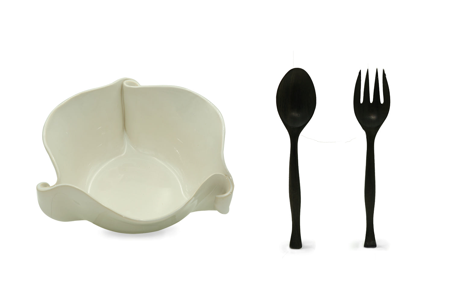 A beautiful salad bowl with curled edges and large black rosewood salad servers.