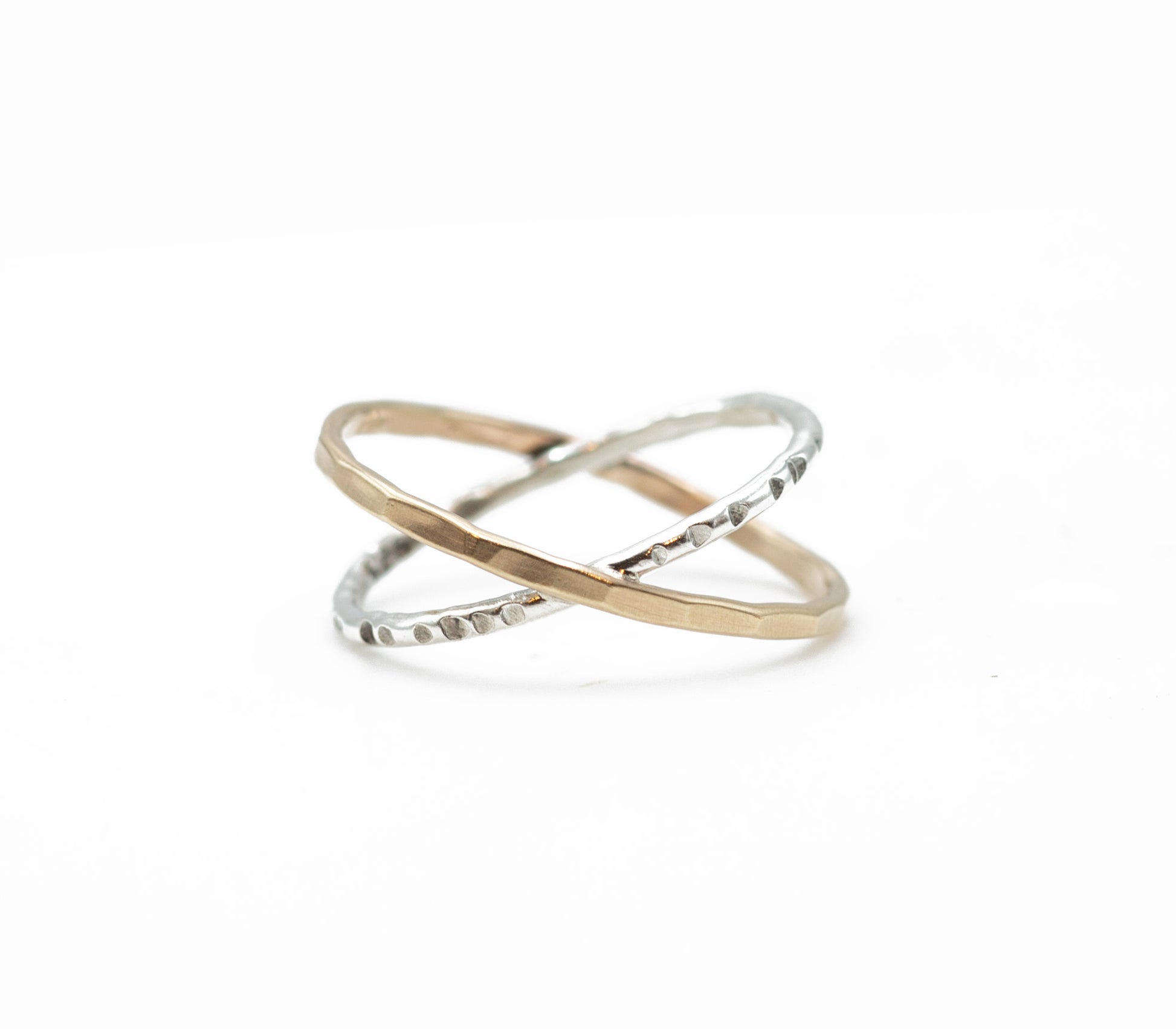 Hammered and etched sterling and 14kt goldfill crisscross bands.