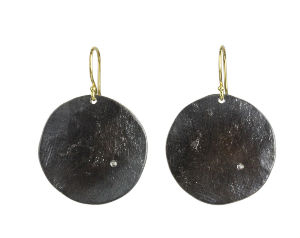 Round textured discs with a tiny bit of sparkle from a tiny diamond. Oxidized sterling with 18k gold earwires give just enough of a two-tone vibe.
