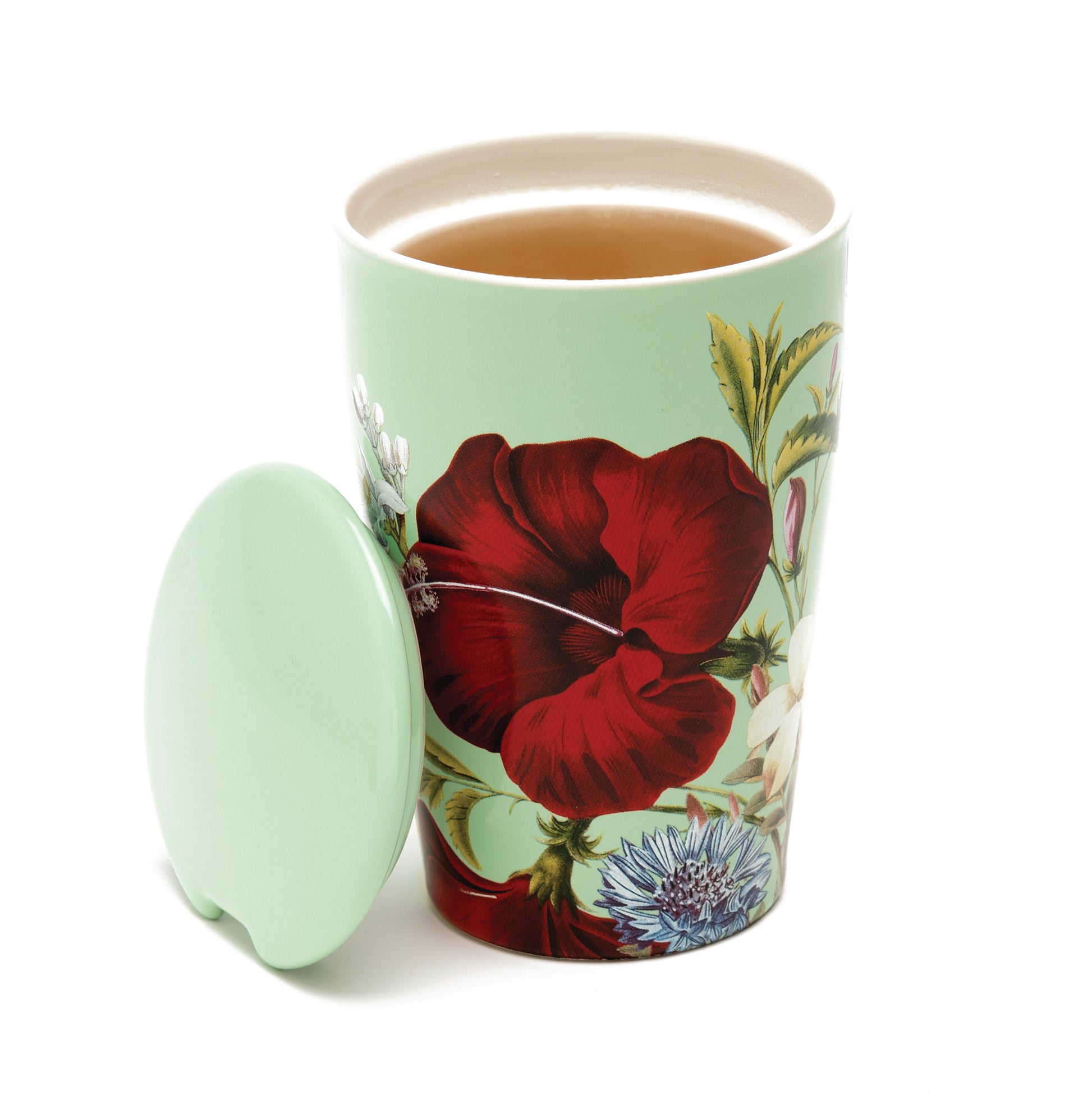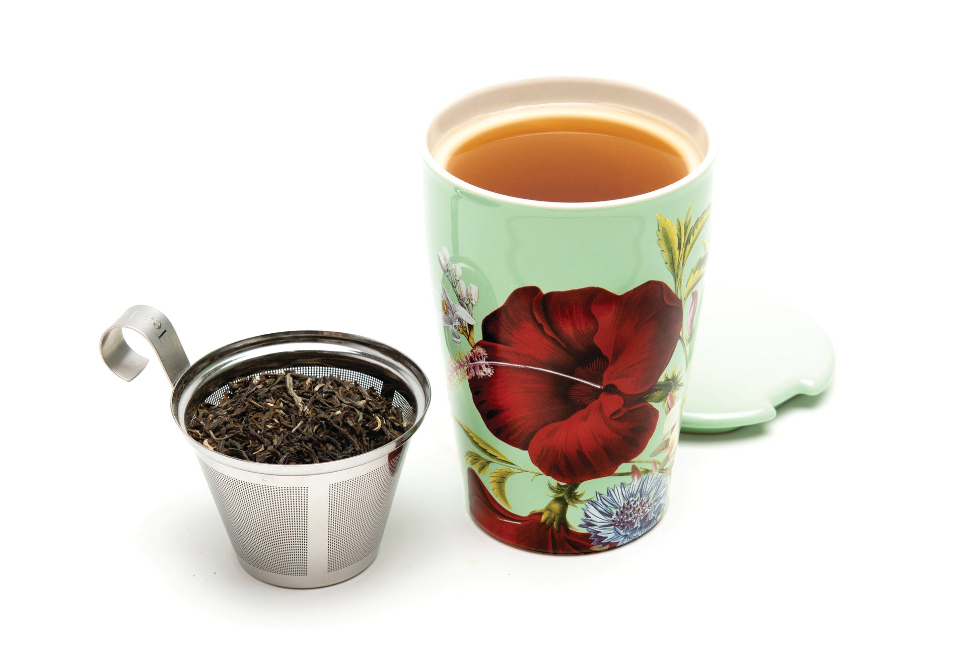This double-walled ceramic tumbler and integrated stainless steel infuser make steeping loose tea by the cup simple. The innovative double-wall construction keeps the tea hot and the tumbler cozy to hold. Add the lid to your cup while steeping. When done, remove and use as a tray for your infuser basket.