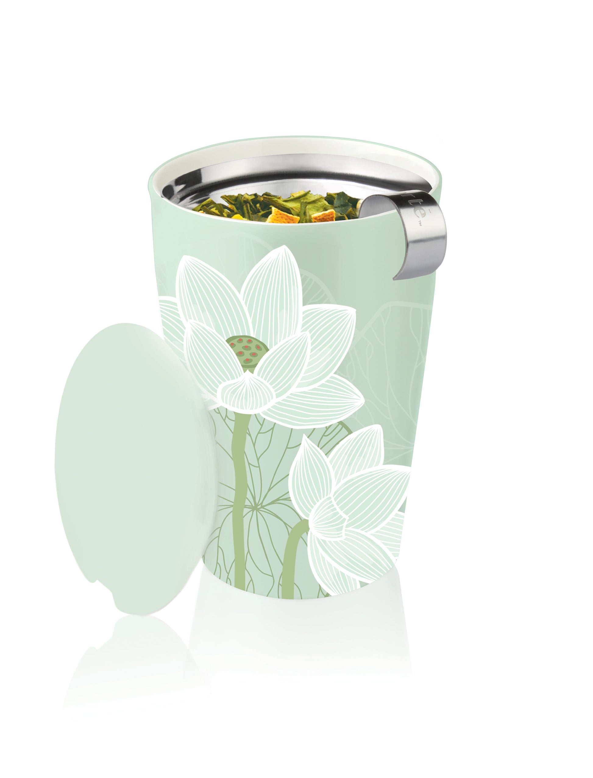 This double-walled ceramic tumbler and integrated stainless steel infuser make steeping loose tea by the cup simple. The innovative double-wall construction keeps the tea hot and the tumbler cozy to hold. Add the lid to your cup while steeping. When done, remove and use as a tray for your infuser basket.