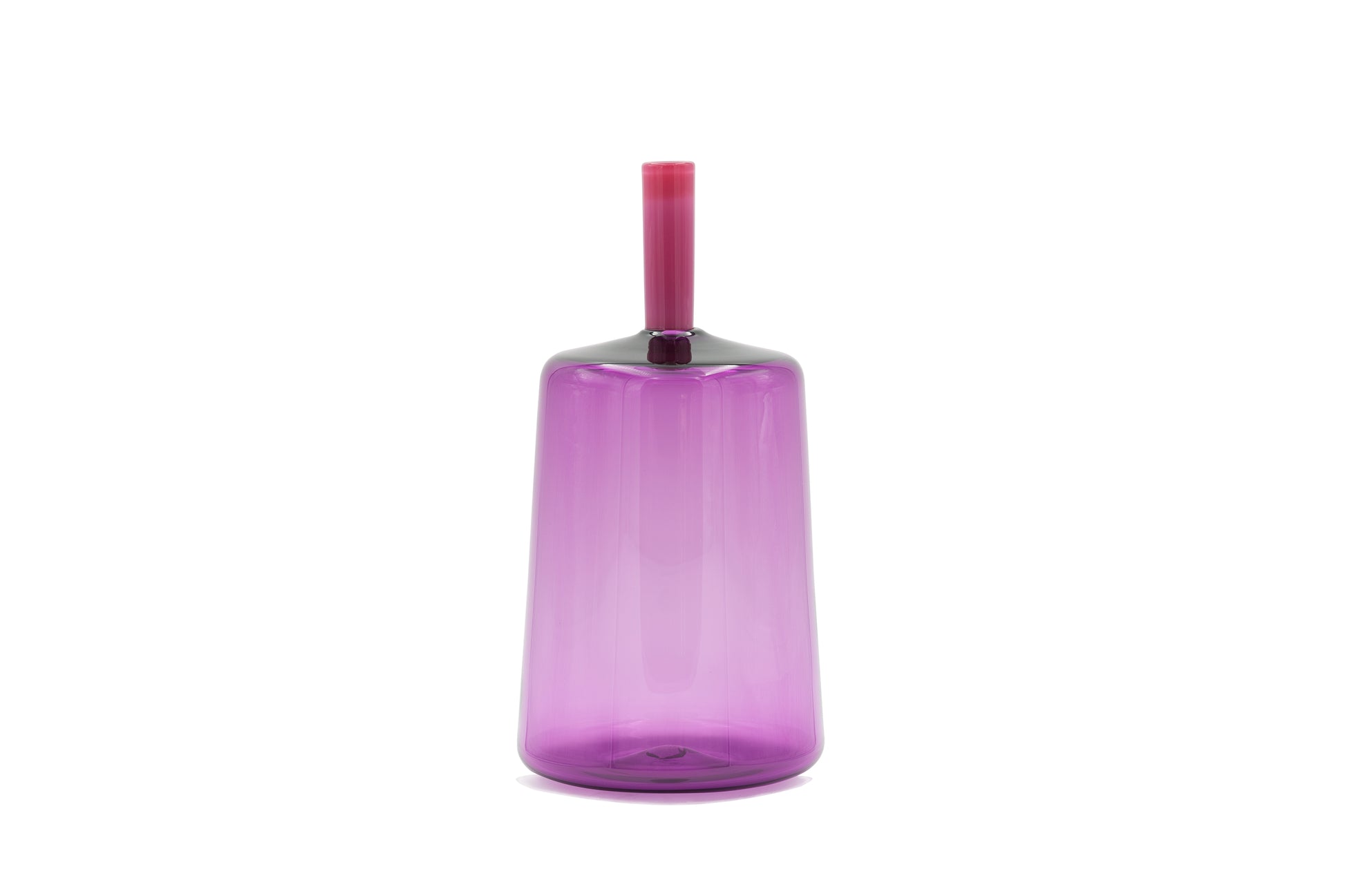 Part of a study of geometric forms, this Tall Slant vase is stunning in a transparent glass topped off by an opaque tube top.